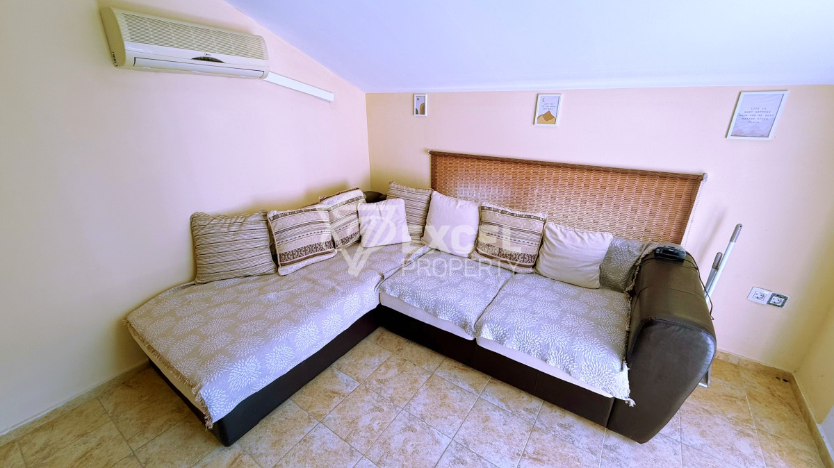 Ексел Пропърти предлага на продажна апартамент с гледка море в Свети Влас. Имота е светъл и слънчев, намира се в комплекс Залив и е напълно обзаведен. Намира се на последния четвърти етаж в сграда без асансьор и е с обща площ от 52 кв.м. Разполага с просторна всекидневна с кухненски бокс, спалня, баня и два балкона. Обзавеждането включва ъглов разтегателен диван, маса за хранене с четири стола, и кухня с всички уреди като фурна, котлони, хладилник, аспиратор, ТВ сет и климатик. Спалнята е оборудвана с двойно легло с нощни шкафчета, гардероб и климатик. Към спалнята балкон има източно изложение и страхотна гледка към морето и планината. Апартамента е подходящ за отдаване под наем или целогодишно ползване. Комплекса е на 50м от морето, разполага с басейн, като в близост ще намерите целогодишно работещ мини маркет, спирка на градския транспорт, училище и детска градина. Комплексът е с АКТ 16 и разполага с басейна и зона за шезлонги и чадъри. Таксата поддръжка е 450 Евро на година.