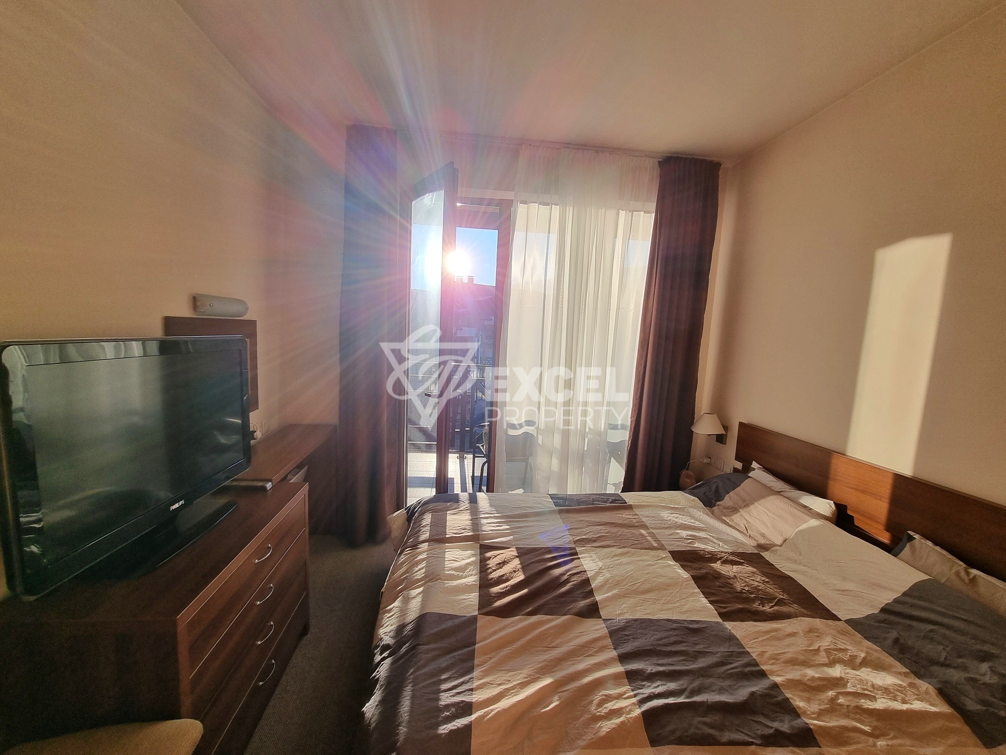 Разпределение на помещенията: дневна с кухненски бокс и трапезарна част, самостоятелна спалня, баня с тоалетна, ски склад и тераса с източно изложение.