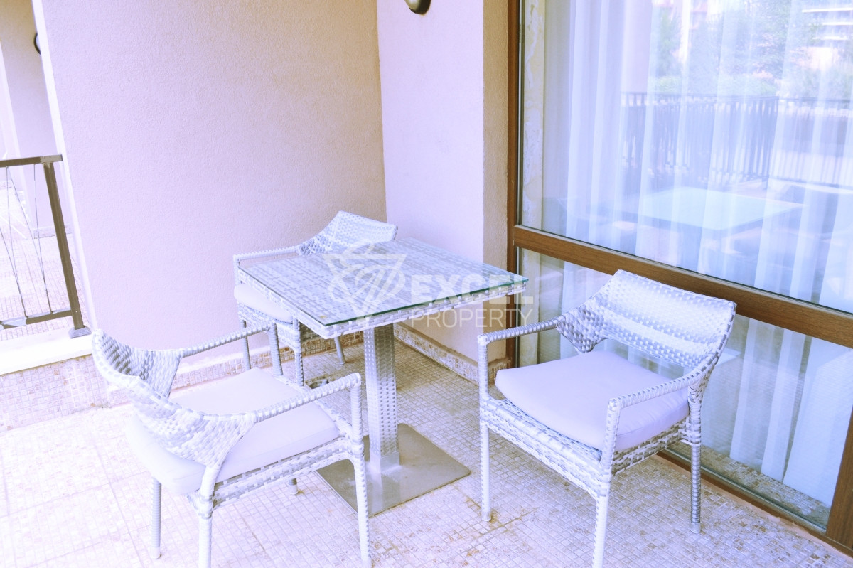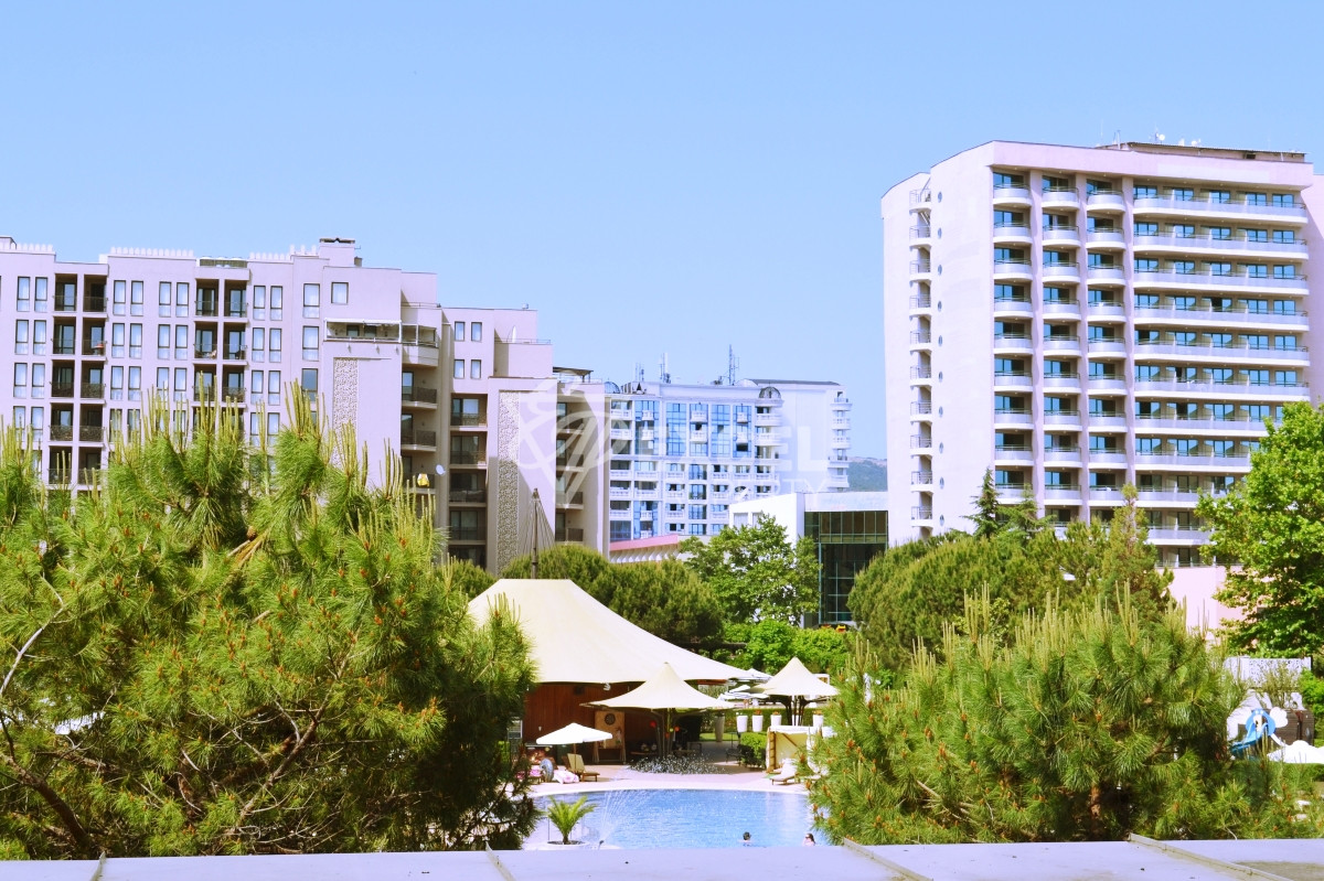 Разпределение на имота : входно антре, хол с трапезария и кухненска част , една спалня, баня с тоалетна и тераса с прекрасна гледка. Терасата е доста голяма, тя е достъпна от двете стаи и разполага с външни мебели. Комплексът се намира в сърцето на Слънчев бряг и предлага луксозни помещения за настаняване и спокойна атмосфера. В голямата градина има уникален комплекс от плувни басейни, шезлонги, зони за почивки, зелени площи и хубава гледка. В комплекса има широка гама от ресторанти и барове, лоби барът е с изглед към басейна и предлага голямо разнообразие от международни напитки. На разположение на гостите има 2-етажен подземен паркинг (срещу допълнително заплащане), прекрасен Спа център и рецепция. Идеално предложение, за покупка с цел отдаване под наем или за лятната Ви почивка! Акт 16 -има
