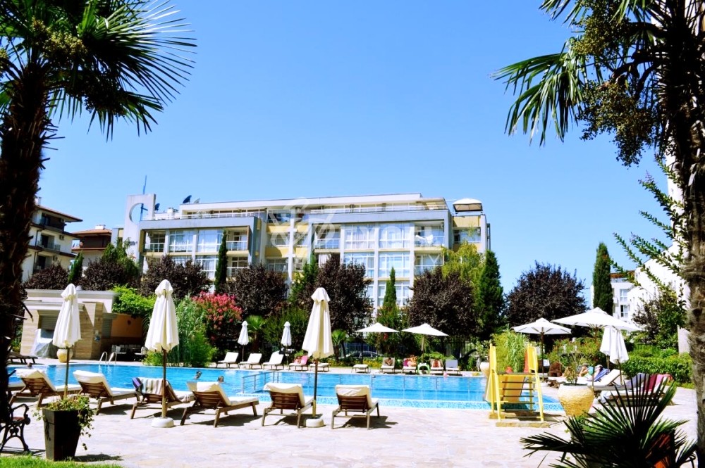 Имотът се предлага обзаведен, като може да бъде закупен с цел последващо отдаване под наем или целогодишно живеене, предлагайки добро разположение, хубава площ и отлично управление на комплекса. Разпределение: отделно входно антре- коридор, оборудвана баня с тоалетна, където има душ-кабина, бойлер; хол с трапезария и кухненска част, една спалня и тераса, която е достъпна от страната и на хола и на спалнята. Имотът има 2 климатика, кухненският бокс разполага с хладилник, пералня, ел.котлон, аспиратор, микровълнова и необходимите уреди за готвене. В хола има ТВ и разтегателен диван. Жилищен комплекс Слънце и Море се намира на 600 м от популярния плаж Какао бийч, на 300м. от автобусна спирка, на 25 км. до летище на град Бургас и на 3 км до стария Несебър. Целогодишно в Слънчев бряг функционират магазини за хранителни стоки, супермаркети, клиника, медицински център, поща, детска градина, а училища има в Несебър и град Свети Влас. Сградата е монолитно строителство, южно изложение. Комплексът разполага с целогодишна охрана, закрит паркинг, затворена зона (входни чипове), паркинг за велосипеди, детска площадка, басейн за възрастни и деца с пързалка (през летния сезон), ресторант в комплекса (през летния сезон), сауна (целогодишно).