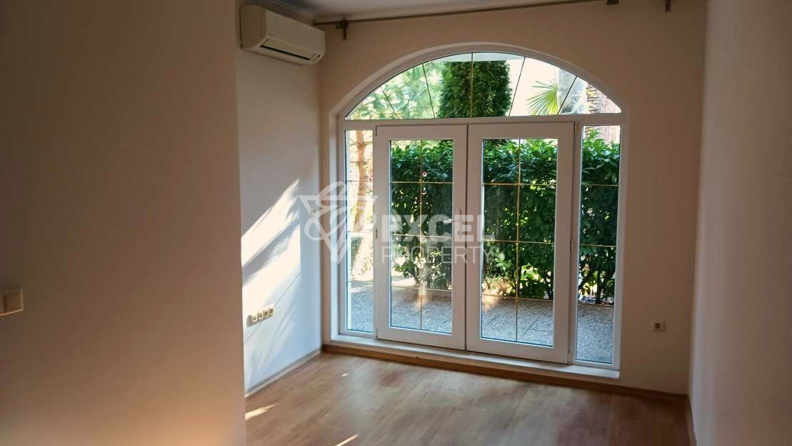 Предлагаме за продажба апартамент с една спалня със самостоятелен двор от 14.47 кв.м. с гледка към басейна и градината на комплекса разположен на партерен етаж в ексклузивния комплекс , който пленява с просторната си богато озеленена градина и неповторимата атмосфера на уединение, хармония и комфорт. Комплексът създава усещане за близост до природата, като същевременно се намира само на около 10 минути пеша от плажа, в близост до Какао бийч, множество ресторанти и атракции в курорта. Апартаментът е с жилищна площ 33.73 м2, общи части 5.21 м2, обща площ 38.94 м2. Продава се с довършителни работи до ключ.С готова баня и един климатик в хола. Състои се от входно антре, всекидневна, с изводи за кухненски бокс, една спалня, напълно оборудвана баня с тоалетна: мивка, бойлер, хигиеничен душ, стъклен параван. Имотът има и тераса , която е с прекрасна гледка и директен достъп до парка, басейна на комплекса.