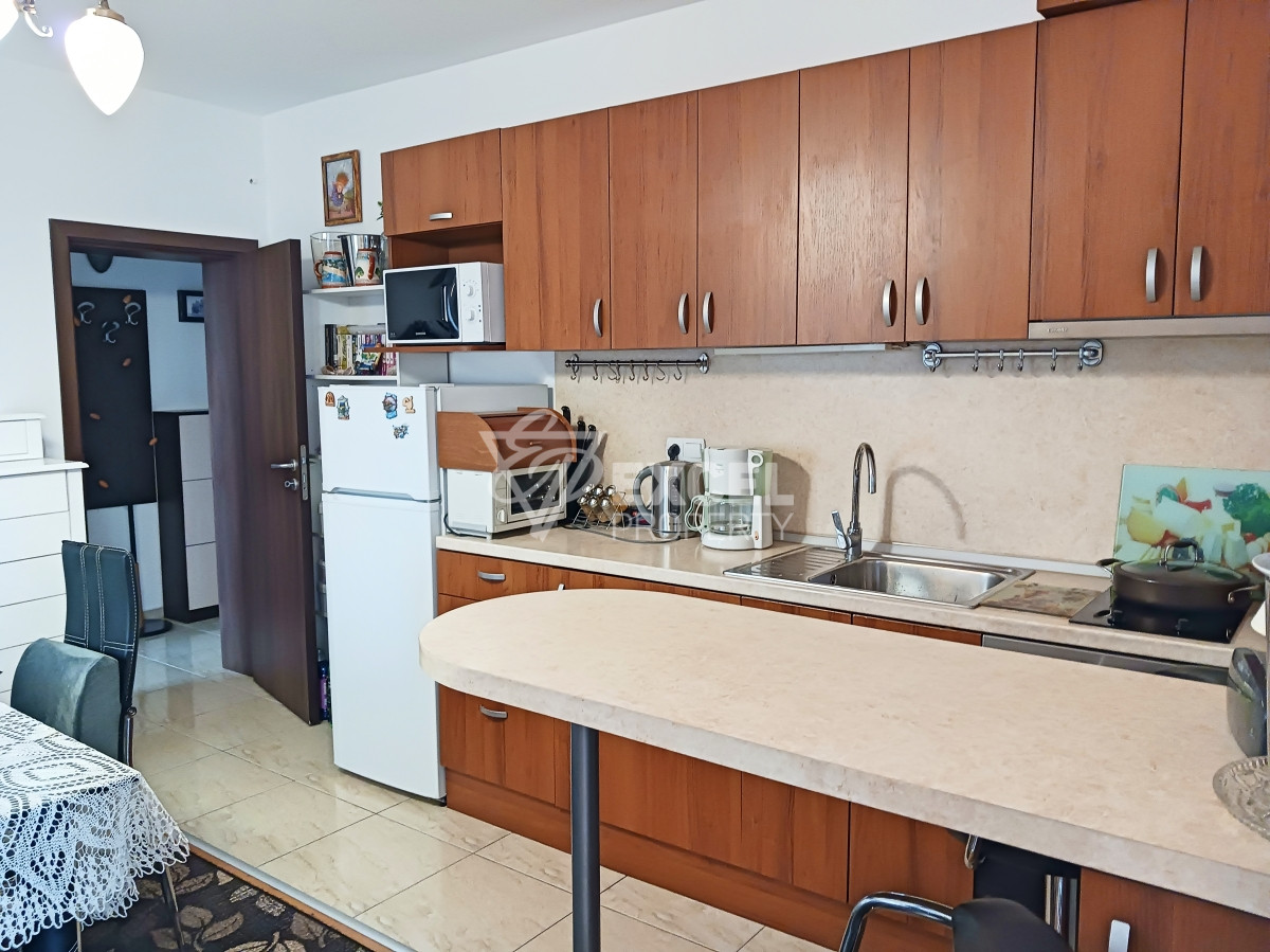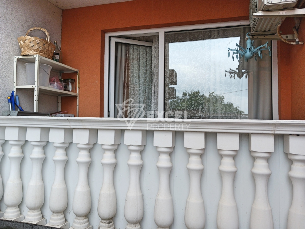 Имотът е добре обзаведен, не е преходен, състои се от отделно антре- коридор, дневна с кухненски бокс и зона за хранене, една спалня, баня с тоалетна и тераса. Терасата е достъпна от страна на всекидневната, тя предлага гледка към тихата част на сградата. Апартаментът е оборудван с всичко необходимо, подходящ за целогодишно живеене или последващо отдаване под наем. Кухнята разполага с необходимите мебели и уреди: хладилник, ел. котлон, аспиратор, микровълнова, пералня и вградена фурна. В хола има телевизор и разтегателен диван. Апартаментът разполага с два климатика, а в спалнята и банята има електричски радиатори, което прави имотът удобен и за обитаване извън сезона. Спалнята е светла и просторна, прозорците предлагат гледка към басейна и двора на ваканционния комплекс.Терасата е дава възможност да се оборудва и използва , като зона за почивка с барбекю.