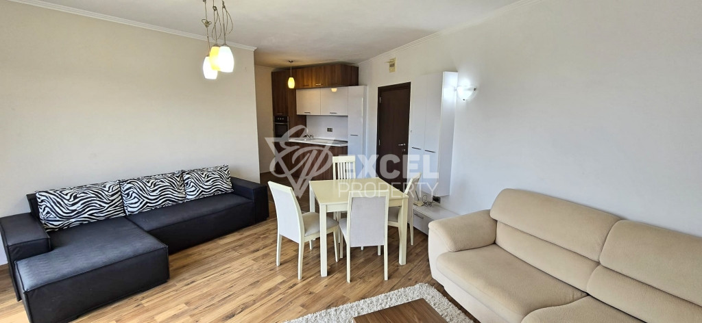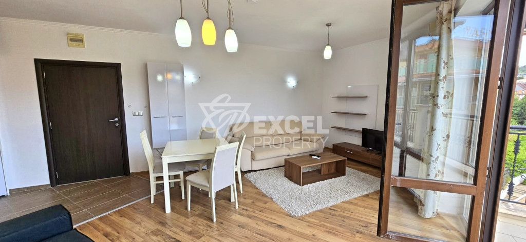 Апартаментът, който предлагаме за продажба се намира на 5-ти етаж, в комплекса има работещ асансьор, той е напълно обзаведен, като балконът му има гледка към морето и планината. Жилището е светло, с обща площ от 71.77 м2, разполага с два климатика, има всички необходими уреди: кухненски бокс с пералня, фурна, ел котлон и аспиратор. Терасата е голяма, разполага с външни мебели и е достъпна от страната на всекидневната.