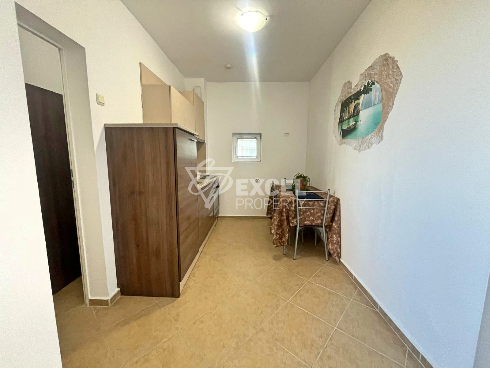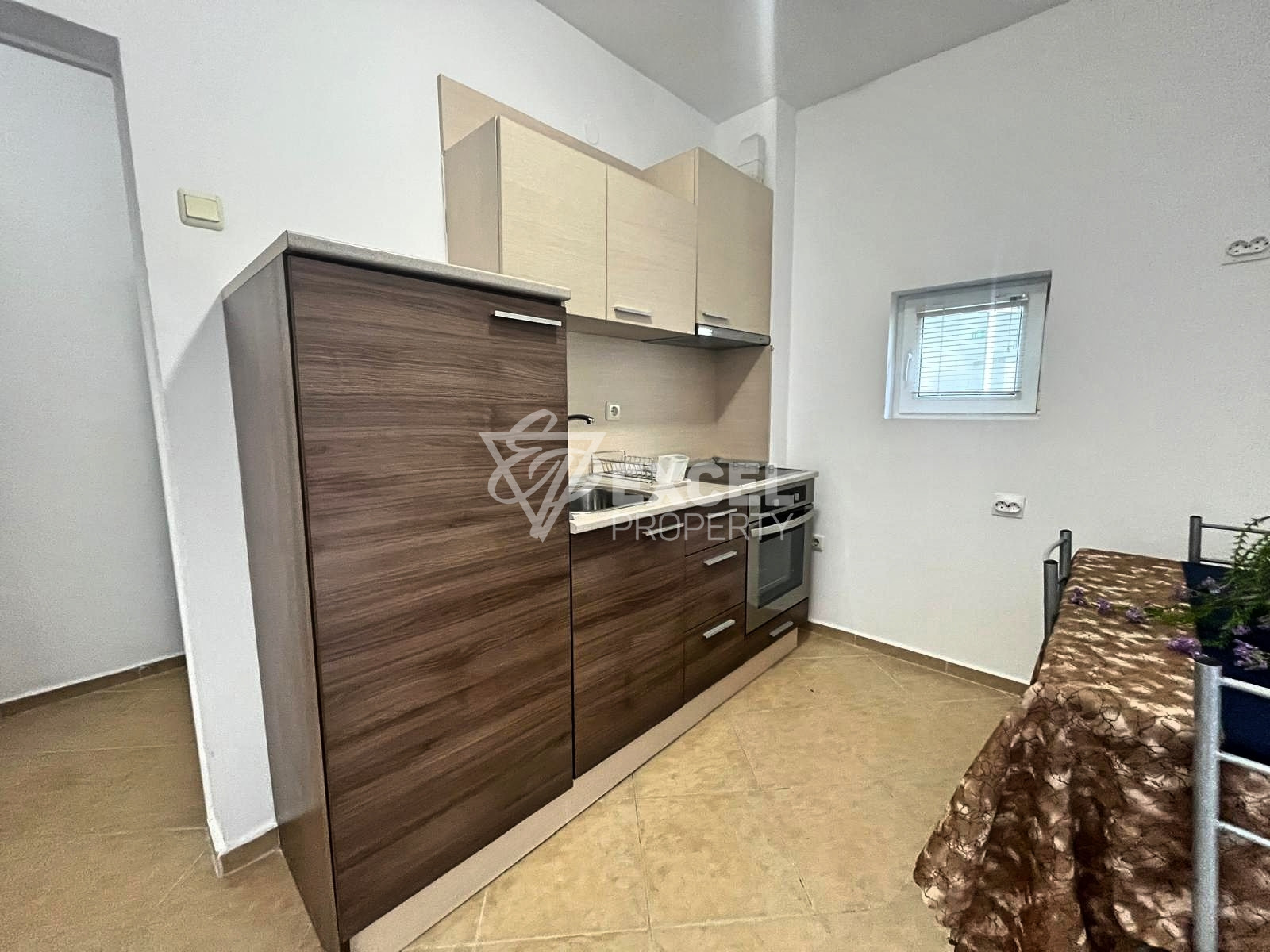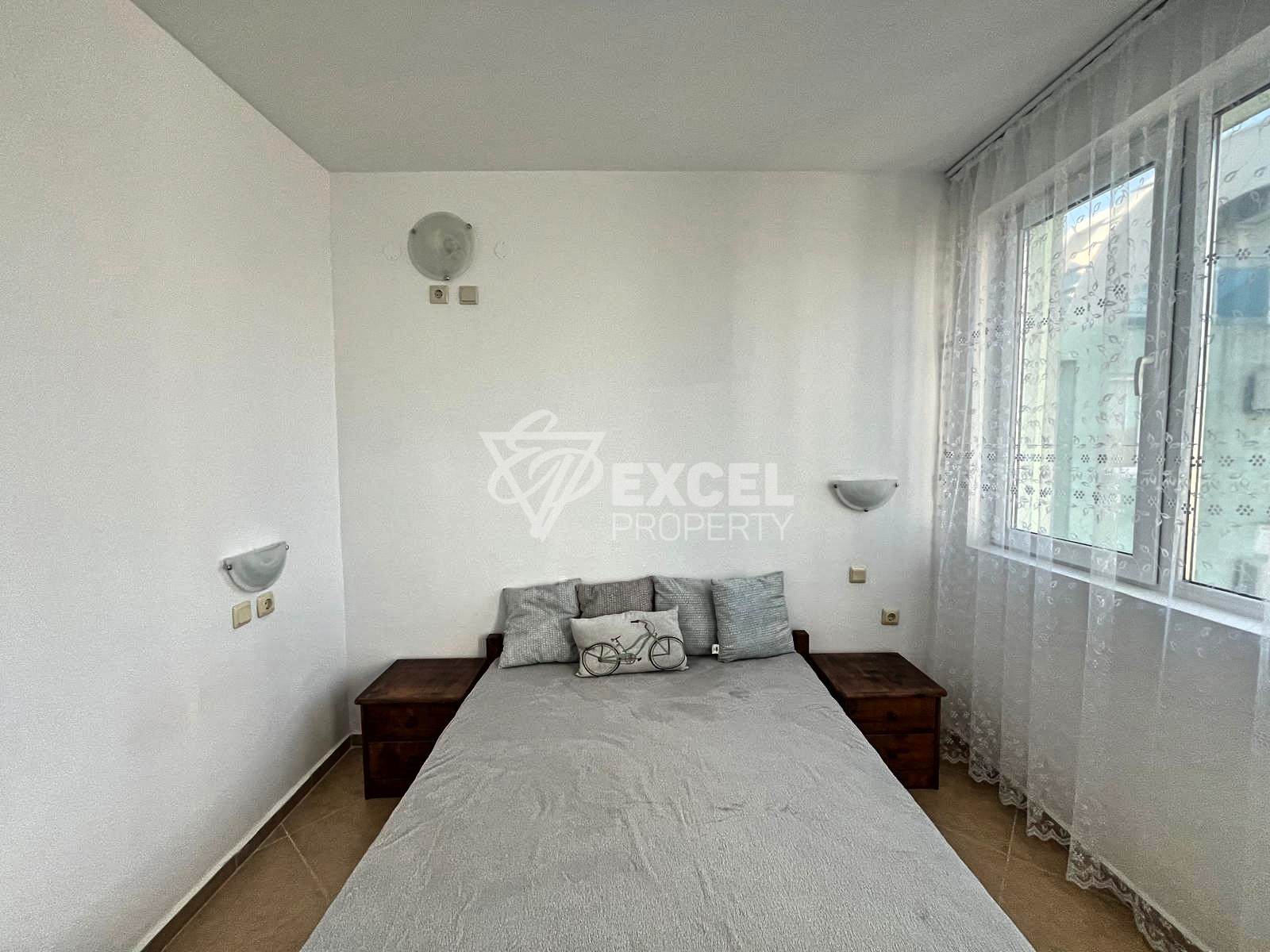 Тук предлагаме за продажба добре обзаведен имот, с разположение: хол с отделна кухненска част, една спалня, баня с тоалетна, втората стая е оборудвана като стая за вещи- с гардероб, има и две тераси, единият балкон е с гледка към морето. Имотът се намира на 4-ти етаж от шест, има и работещ асансьор в сградата, разполага с обща площ от 65.53 м2, подходящ за лятна ваканция или покупка с цел отдаване под наем, както и за постоянен престой. Имотът има и два климатика, две самостоятелни тераси, кухнята е оборудвана с необходимите уреди: шкафове, хладилник, котлон, аспиратор и фурна.