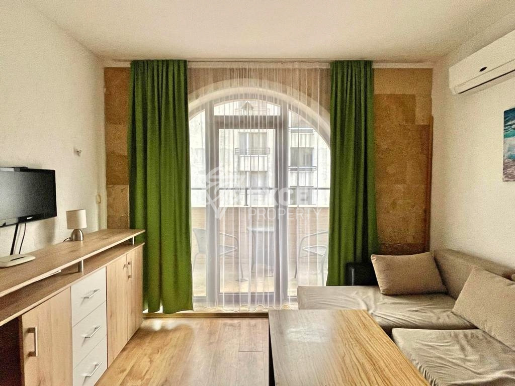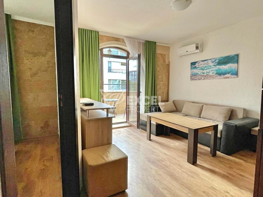 Състои се от входно антре, всекидневна с кухненски бокс, една спалня, баня с тоалетна и тераса. Балконът е достъпен от страната на хола. Продава се напълно обзаведен.