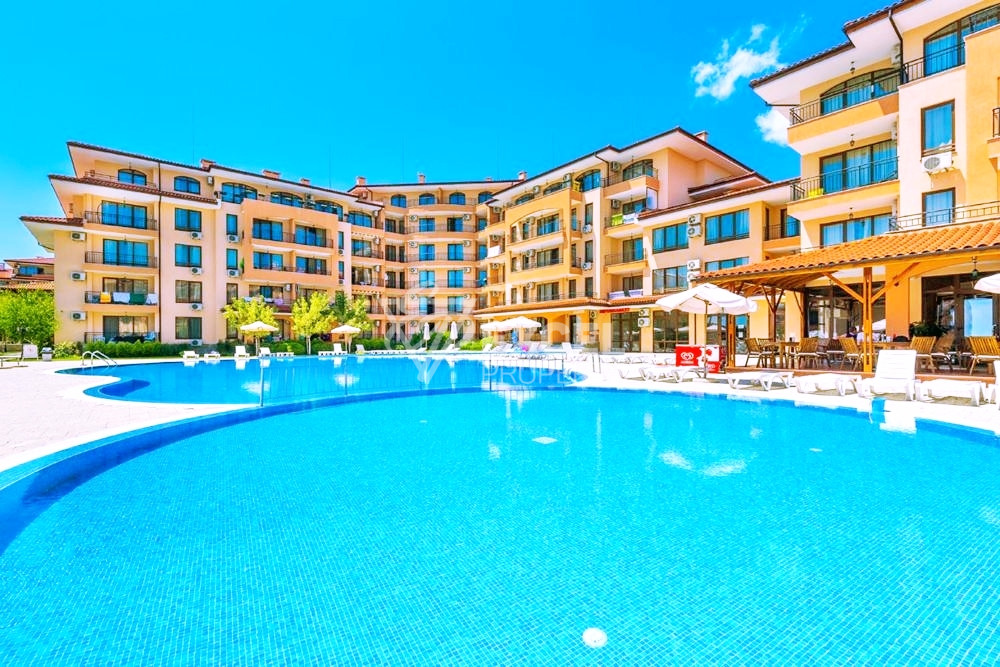 Предлагаме на Вашето внимание двустаен апартамент във ваканционен комплекс- Стар Дриймс- курорт Свети Влас. Апартаментът, който се предлага за продажба, e с обща площ от 75м2, намира се на 2-ри етаж , в сградата има работещ асансьор. имотът е с гледка към басейна. планината и леко гледка море . Имотът разполага с една спалня, всекидневна с напълно обзаведен кухненски бокс: хладилник, фурна, вграден котлон, микровълнова, аспиратор и пералня. Банята е обзаведена с бойлер, душ-кабина и тоалетна. Има и две хубави тераси, достъпни от страната на спалнята и от страната на хола. Имотът е добре обзаведен, подходящ за живеене на 5 човека. Разполага и с два климатика /във всяка от стаите/. Комплексът е разположен само на 100 метра от морския бряг между град Свети Влас и курортен комплекс Слънчев бряг. В близост е разположен най-модерният фитнес център в курорта, а само на 2 км. е красивото яхтено пристанище, подходящо за разходка и отдих. За удобството на собствениците в комплекса са на разположение два басейна, голяма детска площадка, красиви зелени площи, открит фитнес, 24-часова охрана, паркинг и професионална поддръжка. Идеално предложение за лятната Ви почивка или покупка с цел инвстициа и последващо отдаване под наем. Комплексът има Акт 16