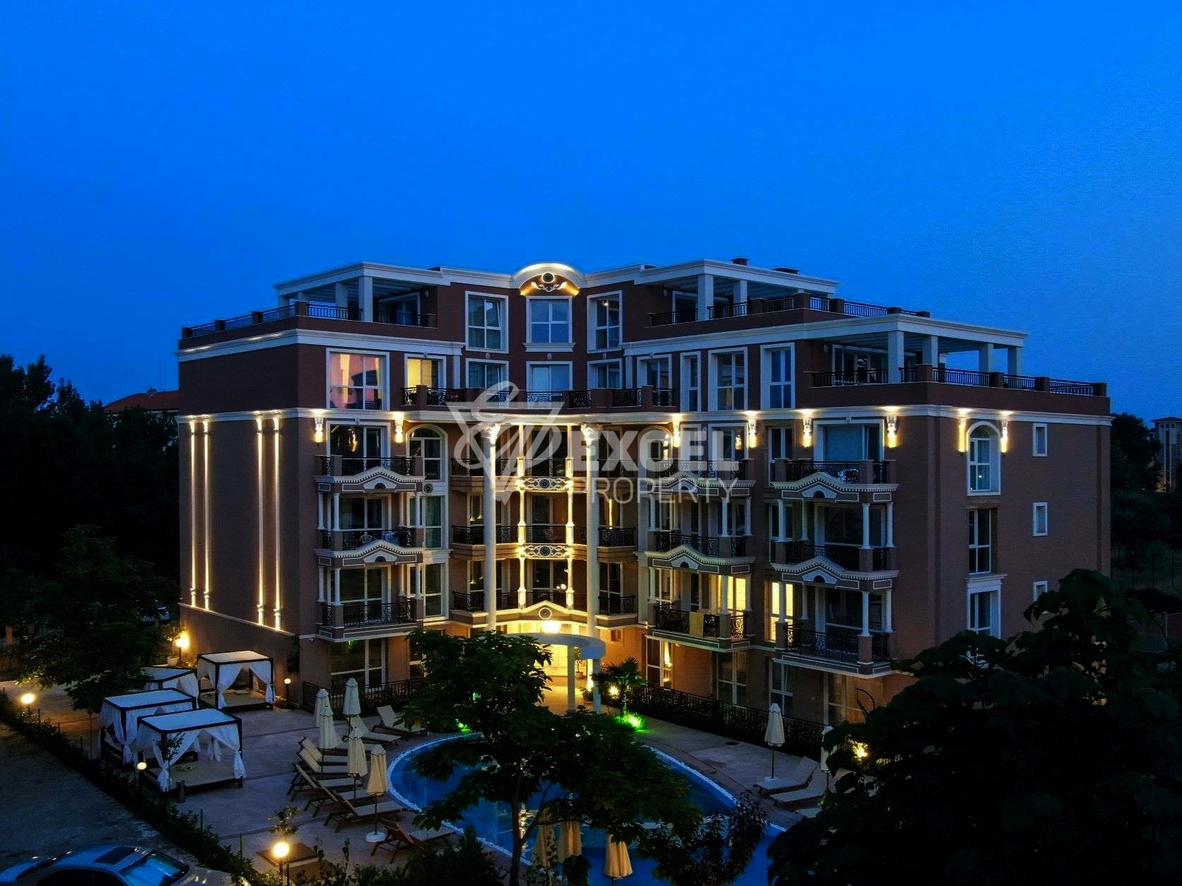 Комплексът предоставя на клиентите следните удобства: 2 външни басейна, зона за барбекю оборудвана с 2 барбекюта и мека мебел, вътрешен отопляем басейн, луксозен СПА център с финска сауна с хималайска сол, инфрачервена сауна, парна баня, шоково ведро, зона за релакс със звездно небе, кабинети за масажи и козметични процедури, просторно фаоайе с Италиански фрези, красива градина, тенис корт и футболно игрище /намират се в парка до комплекса/. Апартаментът е с 2 спални, с ново и стилно обзавеждане и оборудване. Апартаментът е с жилищна площ 69.70 м2, общи части 14.34 м2- обща площ 84.04 м2. От всекидневната и едната спалня се излиза на просторна тераса с гледка към басейна. Наличието на целогодишно обслужване, охрана, СПА-център и закрит басейн, прави комплекса привлекателен за целогодишно ползване.