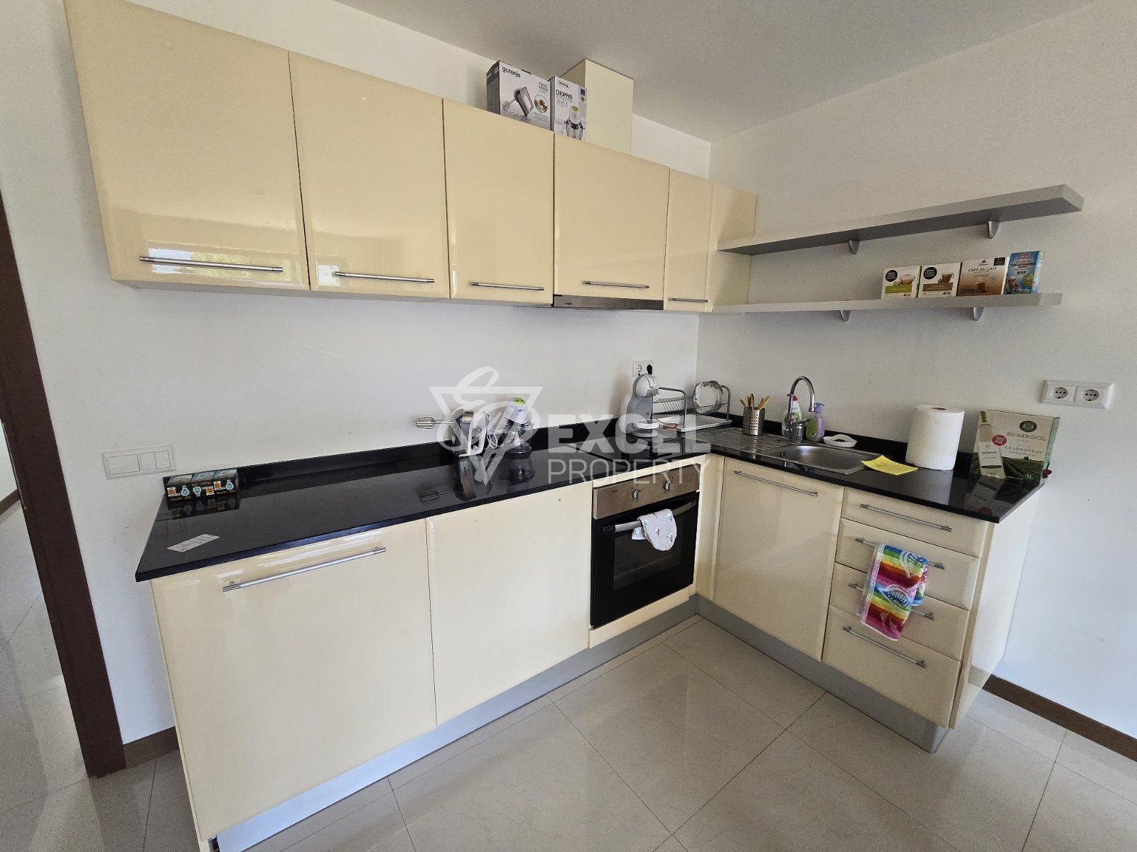 Имотът е разположен на втори жилищен етаж и включва входно антре, две спални - една от тях е мастър бедруум със самостоятелна баня с тоалетна и вана, втора слънчева спалня, допълнителна баня с тоалетна и душ кабина, просторна дневна с оборудвана кухня, кът за хранене и зона за отдих с уютна мека мебел, тераса с южно изложение .